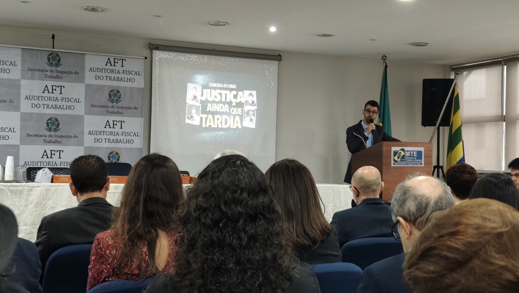 Na abertura da atividade na SRTE/GO, foi realizado um Ato de Memória pelos 22 anos da Chacina de Unaí. O momento contou com uma apresentação detalhada sobre o caso, resgatando a memória da luta dos familiares de Eratóstenes de Almeida Gonçalves, João Batista Soares Lage e Nelson José da Silva, Auditores-Fiscais do Trabalho, e de Ailton Pereira de Oliveira, o motorista que os conduzia. As quatro vítimas foram assassinadas em uma emboscada organizada pelos chamados “reis do feijão” do noroeste mineiro, em 28 de janeiro de 2004, e o ato também relembrou as mobilizações da categoria por justiça.