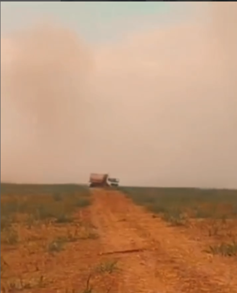 Moradores do Acampamento Leonir Orback tentam conter o fogo que se aproximava do acampamento, enquanto funcionários da Fazenda Santa Helena, com caminhões pipa, assistem de longe, o alastrar do incêndio (Imagens: Divulgação)