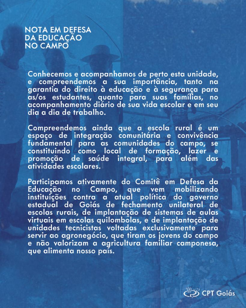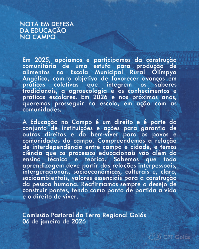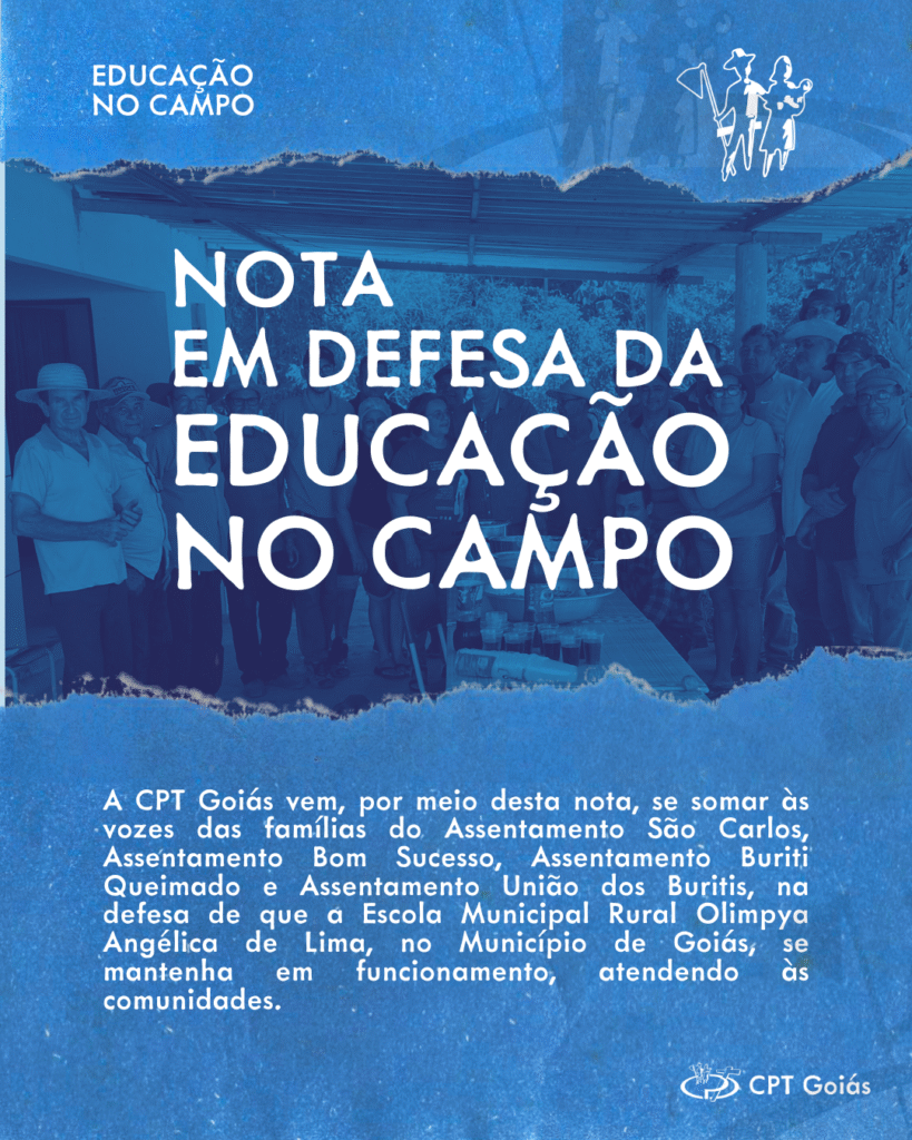 A CPT Goiás vem, por meio desta nota, se somar às vozes das famílias do Assentamento São Carlos, Assentamento Bom Sucesso, Assentamento Buriti Queimado e Assentamento União dos Buritis, na defesa de que a Escola Municipal Rural Olimpya Angélica de Lima, no Município de Goiás, se mantenha em funcionamento, atendendo às comunidades.
