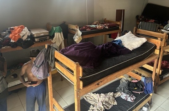No alojamento, o espaço mínimo entre as camas não era respeitado, os trabalhadores não tinham armários, roupa de cama, nem acesso a produtos de limpeza e higiene. Não havia mesas para refeição e as marmitas eram deixadas no chão para que se servissem.